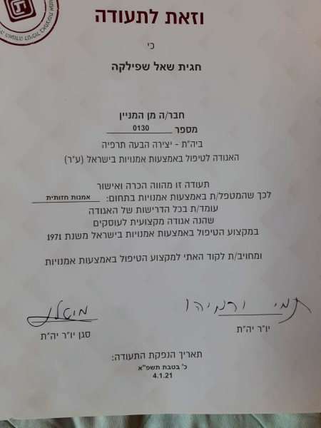גלריית תמונות ותעודות הסמכה של חגית שאל – פסיכותרפיה באמצעות אומנות בקרית טבעון