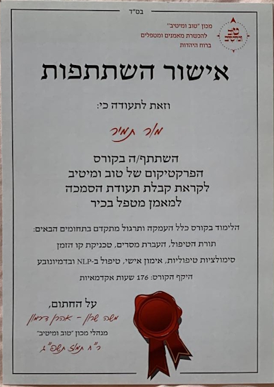 בוגרת "טוב ומיטיב" – בית הספר להכשרת מאמנים-מטפלים.