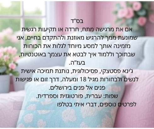 ג'ינא פסטיצקי – טיפול רגשי לנשים ולבנות מעל גיל 18 בציבור הדתי והחרדי.