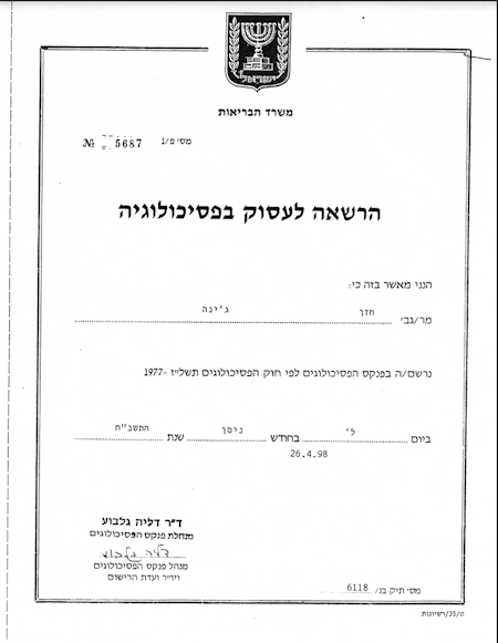 גלריית תמונות ותעודות הסמכה של ג'ינא פסטיצקי – טיפול רגשי לנשים ולבנות מעל גיל 18 בציבור הדתי והחרדי בירושלים ובאונליין