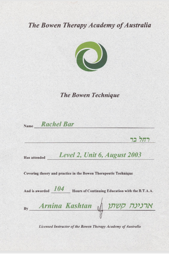 בנוסף, אני מטפלת מוסמכת בשיאצו ובבואן. למדתי שיאצו בבי"ס "מגע" וקיבלתי הסמכה לטכניקת בואן מארנינה קשתן.