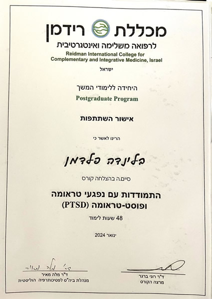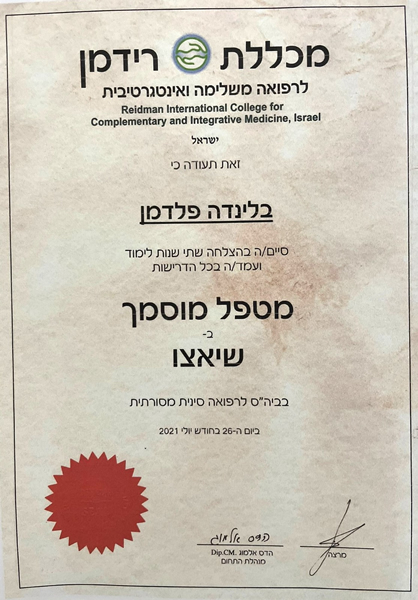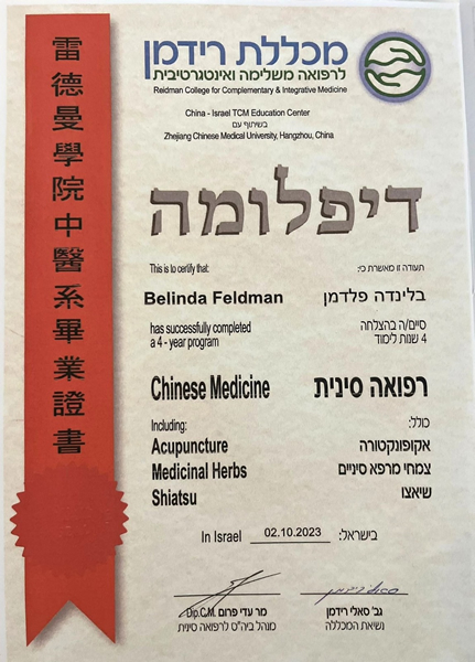 גלריית תמונות ותעודות הסמכה של בלינדה פלדמן – רפואה סינית וטיפול רגשי בגן נר שבצפון