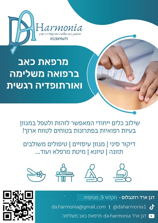 da-harmonia מרפאת כאב משלימה שנוסדה בשנת 1999ובה מספר מטפלות מנוסות. הטיפולים במרפאה מבוססים על הקשר החזק והבלתי ניתן להתרה בין גוף, נפש, נשמה, הכלה, הקשבה, ראיה ומגע. Da-harmonia מרפאת כאב משלימה אשר מציעה טיפולים בהרמוניה בין הרפואה הקונבנציונלית (עולם חומרי ומתועש שבו אנו חיים) והרפואה המשלימה. השילוב הזה בין הרפואות הוא כול כך טבעי עבורנו. מטפלים בעזרת שיטות מגוונות – אורתופדיה רגשית, טווינה, עיסוי תינוקות, אוסטאופתיה, תזונה רגשית, עיסוי רקמות עמוק, עיסוי פנים, דיקור סיני, טיפול בנשים הרות, קרניו סקראל, טיפול רגשי פסיכותרפי ועוד.
