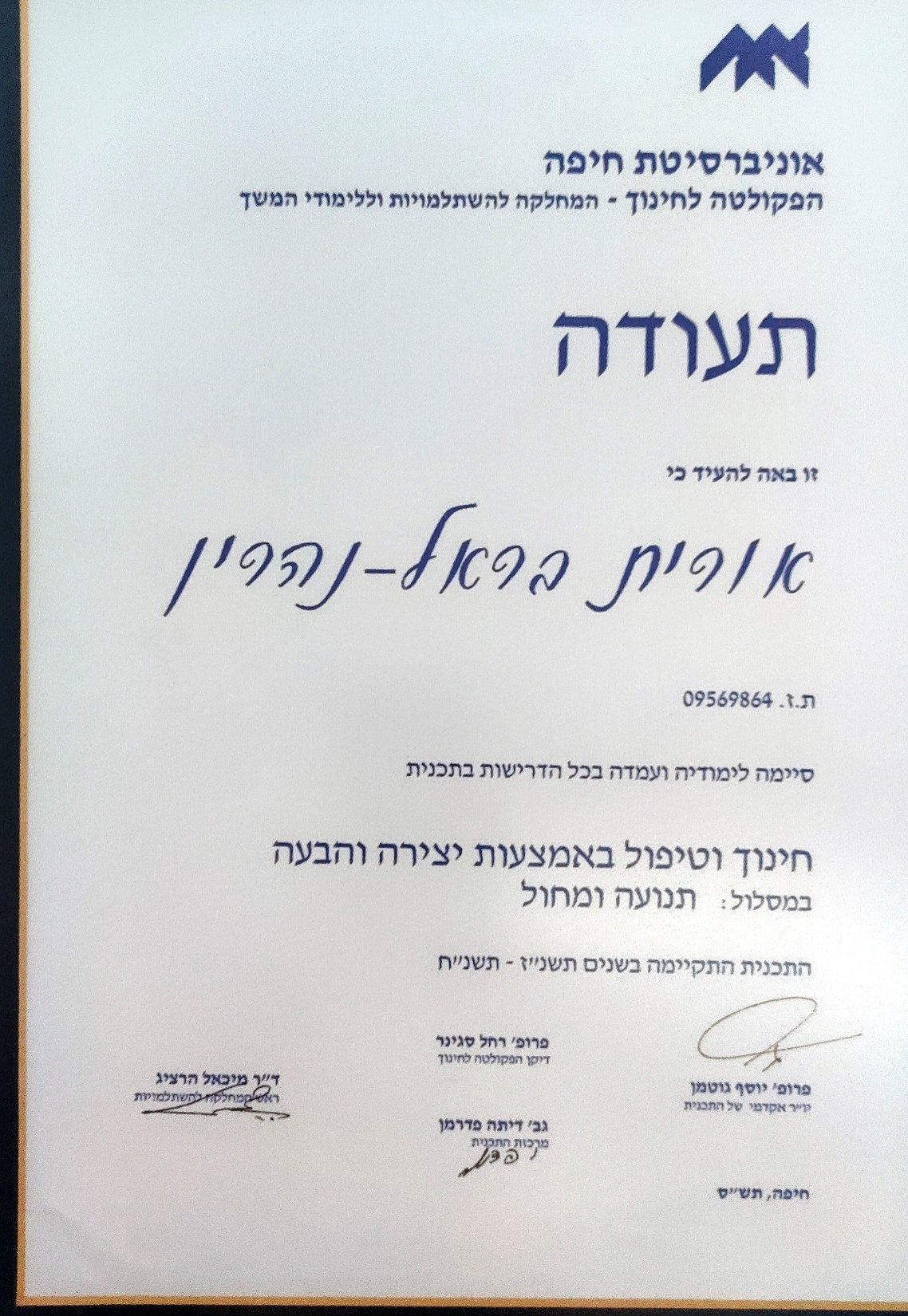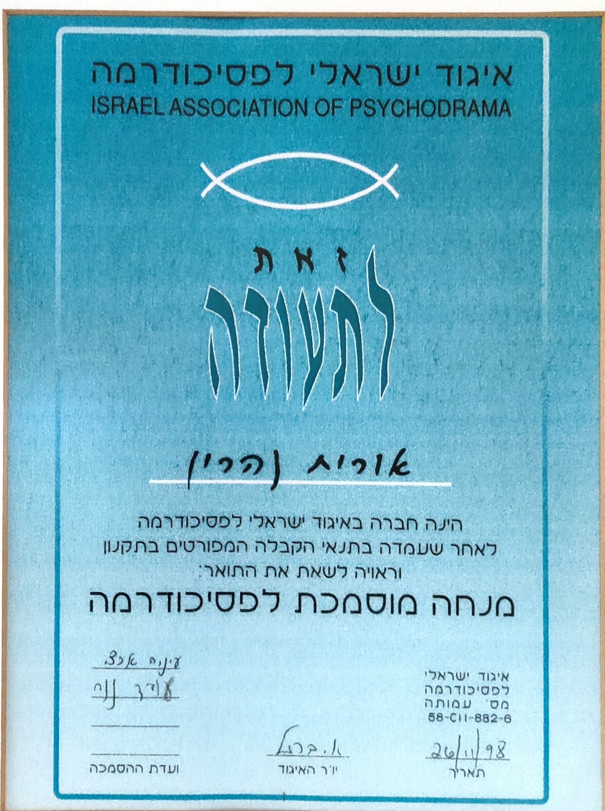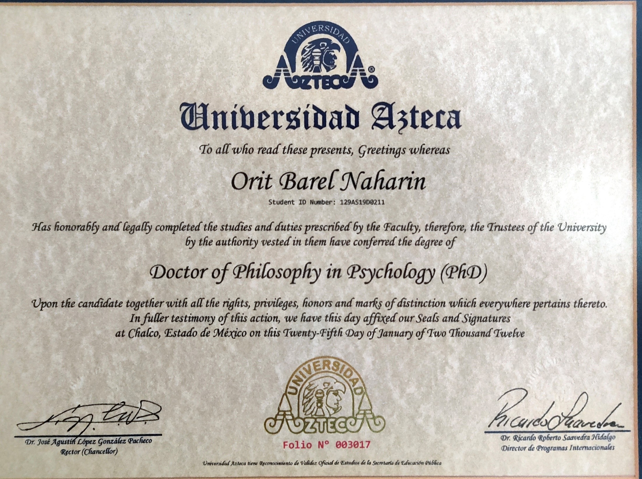 גלריית תמונות ותעודות הסמכה של ד"ר אורית בראל נהרין – מטפלת רגשית בחיפה