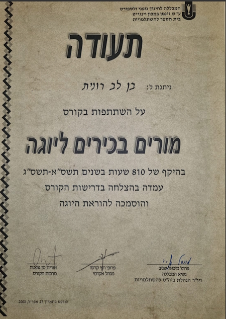 גלריית תמונות ותעודות הסמכה של רוני בן לב – רוניוגה – יוגה טיפולית – סדנאות ותרגול בקיבוץ פלמחים