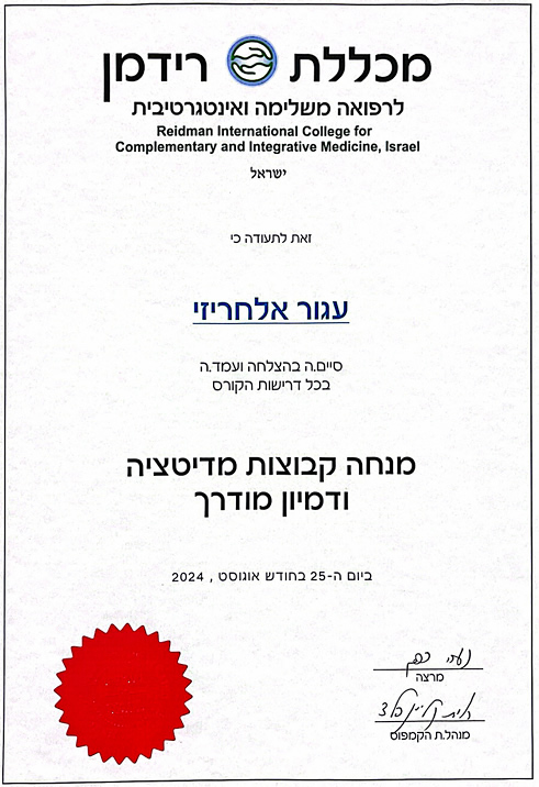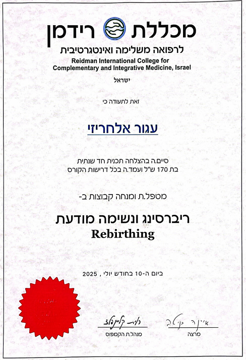 גלריית תמונות ותעודות הסמכה של עגור אלחריזי – מטפלת בדמיון מודרך, מיינדפולנס ומנחת סדנאות ריברסינג בגן יבנה