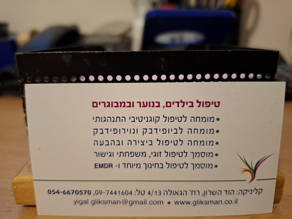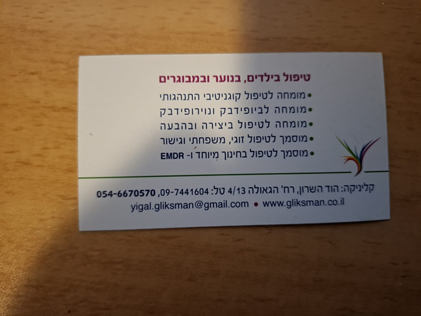 ד"ר יגאל גליקסמן, מומחה לטיפול בבעיות רפואיות, פסיכולוגיות וקשיים תפקודיים. פסיכותרפיסט מומחה – מדריך לפסיכותרפיה קוגניטיבית התנהגותית קצרת מועד, מומחה – מדריך לשיטת הביופידבק, מטפל – מדריך ביצירה והבעה, מוסמך לטיפול זוגי, משפחתי וגישור, מוסמך לחינוך מיוחד, מוסמך לטיפול בשיטת ה EMDR.