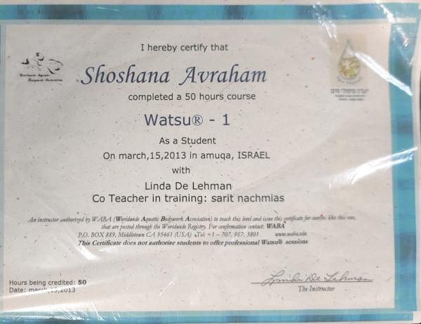 גלריית תמונות ותעודות הסמכה של הכל במים – שושנה אברהם – הידרותרפיה וטיפולים רגשיים