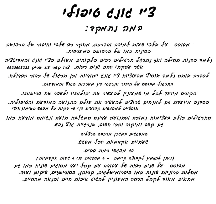 * יש אפשרות לייעוץ טלפוני אישי, טלפון שלי: 072-2285853