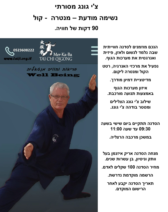 תרגול ולימוד טאי צ'י צ'ואן יאנג 40 מסורתי, טאי צ'י צ'ואן צ'אן 83 עתיק וצ'י קונג מסורתי בחיבור אנרגטי גוף נפש, לבריאות הנאה או טיפול במשכן מרכבה הרצליה.